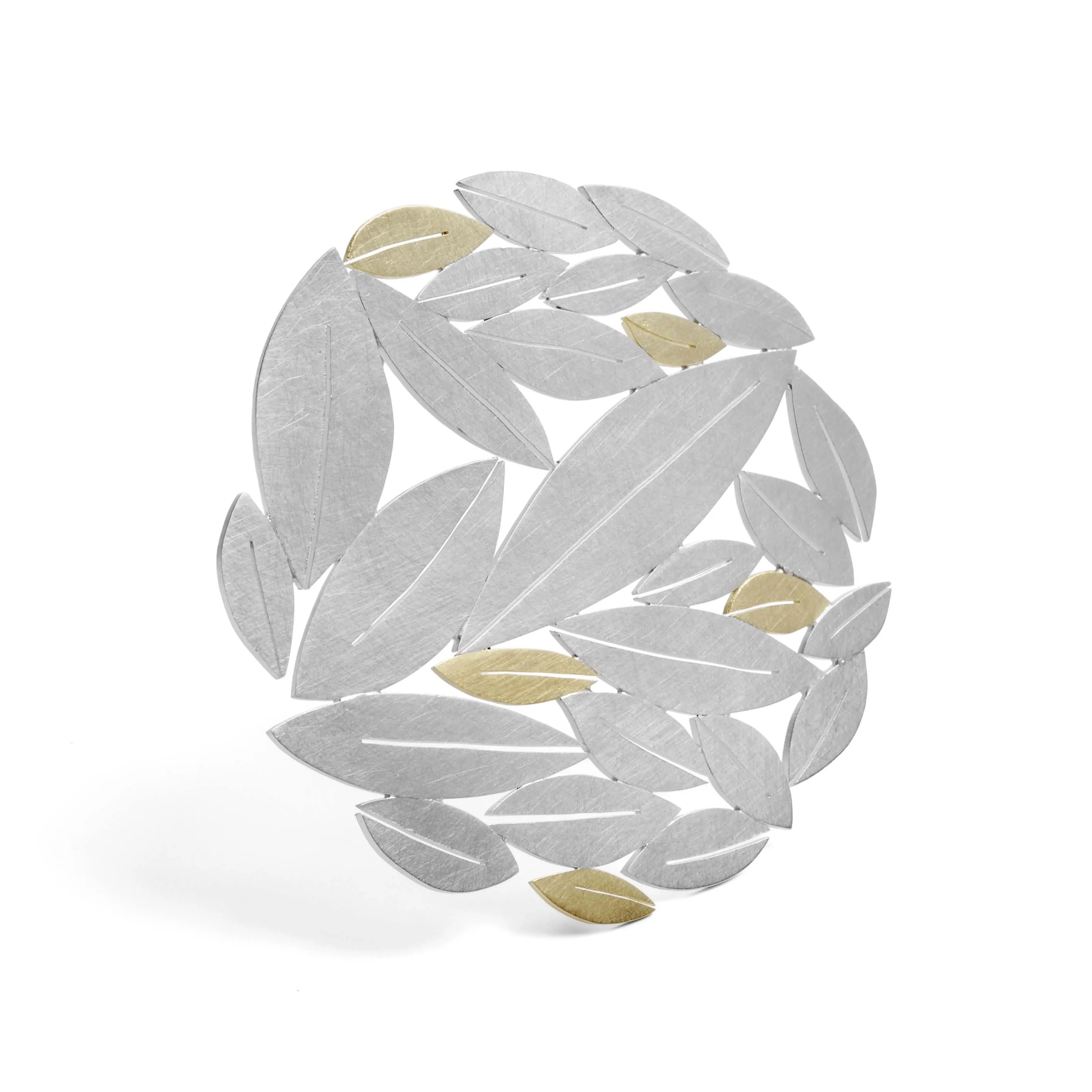 Made from hand-pierced silver and 18ct gold, it features twenty-eight meticulously arranged leaves that form a beautiful circle.