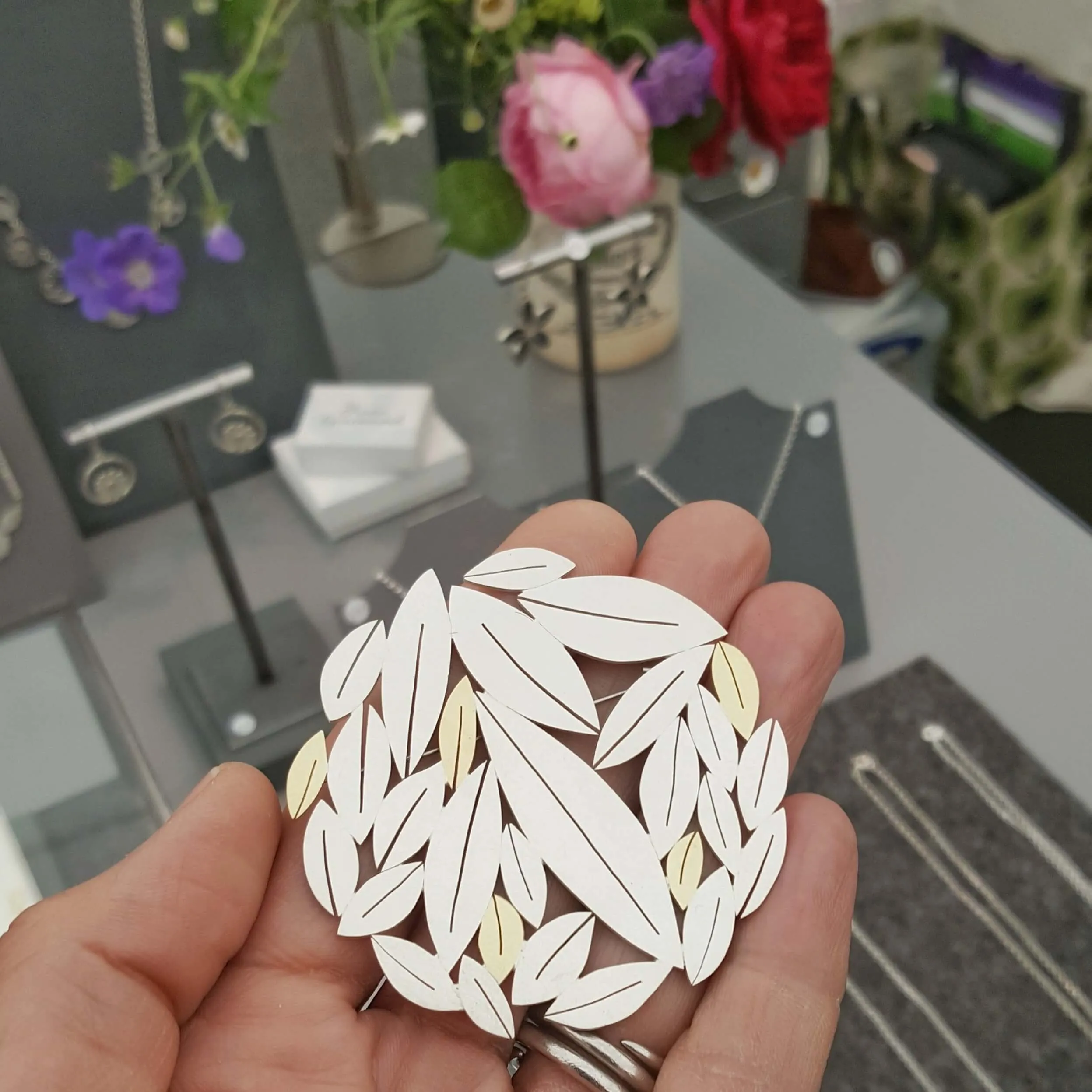 Made from hand-pierced silver and 18ct gold, it features twenty-eight meticulously arranged leaves that form a beautiful circle.